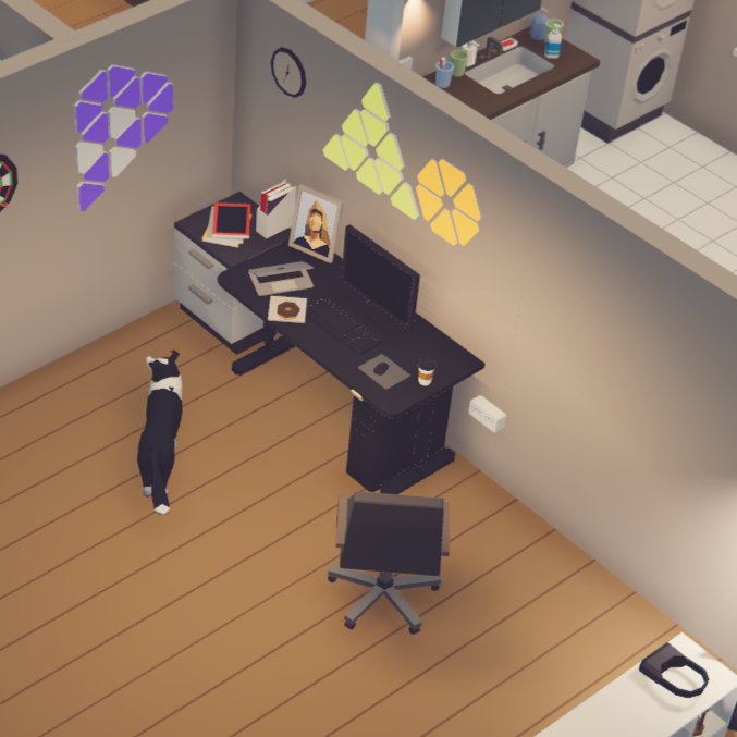 “You know you want the player to feel like they are trapped in a Border Collie’s body, so you have to think about how they can accomplish all the stuff they need to do. It could be as simple as how the environment would look from a dog’s perspective, and how the player navigate through the space. It can also be as complex as picturing how to make sure John’s normal human life would still stay on track. For example, if you have a date coming up today but you are a dog now, what would you do to not mess this up? I like the idea of the player can still make it to the date with this new form. Who doesn’t like a cute dog showing up to the date with a surprise :D Keep in mind that one of our design goals for Oopz-Oofs is to focus on the action combinations a dog could do, and that’s why I really enjoyed the idea of spinning the card rack with the paws, praying for the correct card to fall out from the sky.“